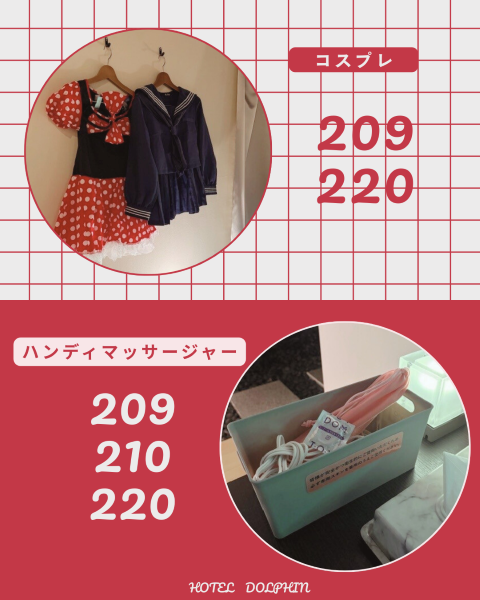 皆さんこんにちは! 【TypeE】209・210・220号室にハンディマッサージャーを設置し、 さらに209・220号室はコスプレもお部屋にご用意いたしました。 コスプレは数種類の中からランダムでお部屋に置かれますので、 どの衣装になるかは入室…