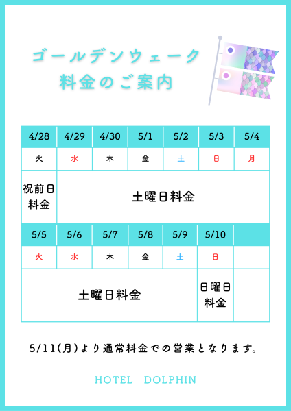 皆さん、こんにちは! いつもホテルドルフィンをご利用いただき、 誠にありがとうございます❁ ゴールデンウェーク期間中の料金についてご案内いたします。 【GW期間の料金】 ・4月28日:祝前日料金 ・4月29日~5月9日:土曜日料金 ・5月…